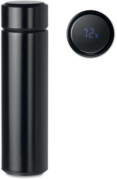 Duplafalú, szivárgásmentes rozsdamentes acél termosz teaszűrővel. A fedélben beépített érintős hőmérővel. A működéshez szükséges 1 cserélhető CR2032 elemmel szállítjuk. Űrtartalom 450 ml. Szivárgásmentes.