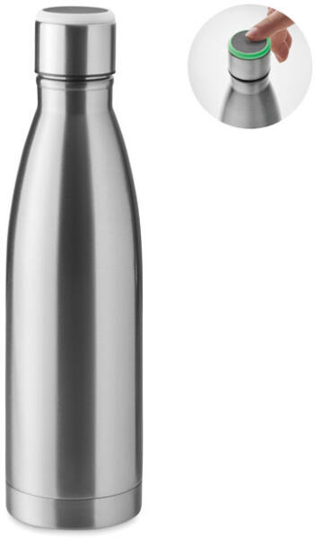 Duplafalú rozsdamentes acél palack hidratációs emlékeztetővel. A kupakba épített fény óránként világít, emlékeztetve a folyadékbevitelre. A működéshez szükséges 1 db CR2032 elemmel szállítjuk. Űrtartalom: 500 ml.