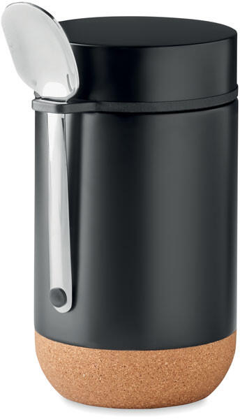 Duplafalú, rozsdamentes acélból készült, termoszedény csavaros kupakkal és parafa aljjal. Kanállal együtt. Űrtartalom: 400 ml.