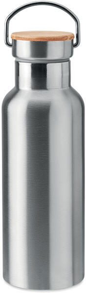 Duplafalú rozsdamentes acél termosz 500 ml űrtartalommal. Fém fogantyús bambusz kupakkal. A szublimációs nyomtatás csak a fehér színű terméken érhető el. Szivárgásmentes. A bambusz természetes anyag, színében, mintázatában és méretében esetenként eltérő lehet.
