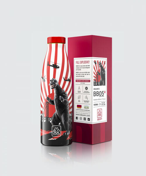 Godzilla nem csak egy szörnyeteg. Igazi hős. Kétségtelenül nagy harcos, pont olyan mint te. A grafikája miatt a gyerekek is imádják Godzillát. A rozsdamentes BB05 kulacs, a 100%-ban Olasz dizájnnal rendelkező rozsdamentes acél, hőszigetelt vizes palack. Csillogóan fényes bevonattal, vörös, szilikon csúszásgátló talppal és ikonikus piros kupakkal. A BBOOM palackkal együtt né