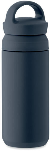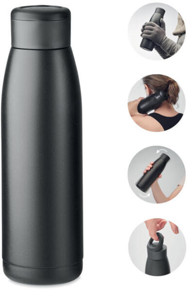 Duplafalú rozsdamentes acél palack, fogantyúval ellátott fedéllel. Szivárgásmentes. Űrtartalom: 500 ml.