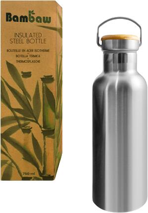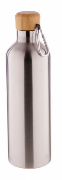 Duplafalú, rozsdamentes acélból készült termosz bambusz kupakkal és karabinerrel, 500 ml.