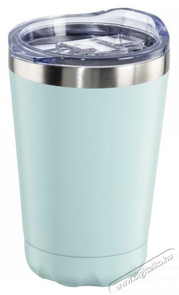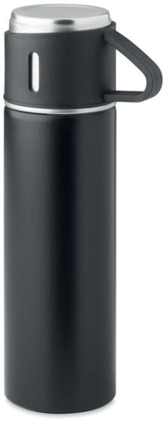 Duplafalú, rozsdamentes acél termoszpalack szivárgásmentes, bögre kupakkal. Űrtartalom: termoszpalack 420 ml, bögre 150 ml.