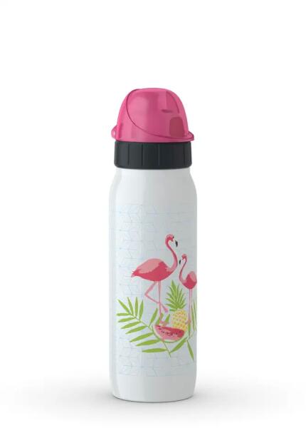 Robusztus és mégis könnyű nemesacélból** készült palack vidám képekkel díszítve. A 100% vízálló szerkezetének köszönhetőn mosogatógépben mosható, a csavarható kupak kétutas nyitása révén pedig környezetbarát és 100% biztonságos, ami nyugalmat biztosít neked és hozzátartozóidnak is.