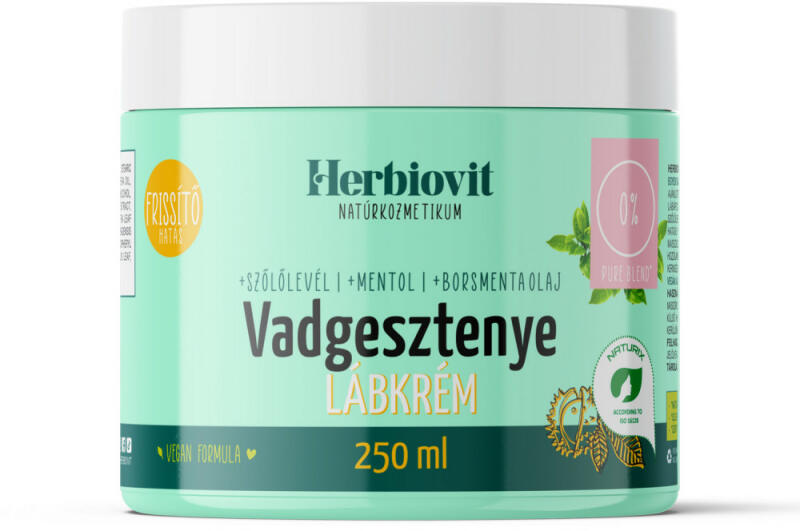 Vadgesztenyés lábápoló krém, hozzáadott vadgesztenye és bortermő szőlőlevél kivonattal, borsmenta olajjal és E-vitaminnal. Vegán formula. Bőrnyugtató és bőrápoló hatású aloe vera juice és varázsmogyoró kivonat kombinációra épülő egyedi krémbázissal. Hatóanyagainak köszönhetően - vadgesztenye és bortermő szőlőlevél kivonatok - kiválóan alkalmazható a vissz