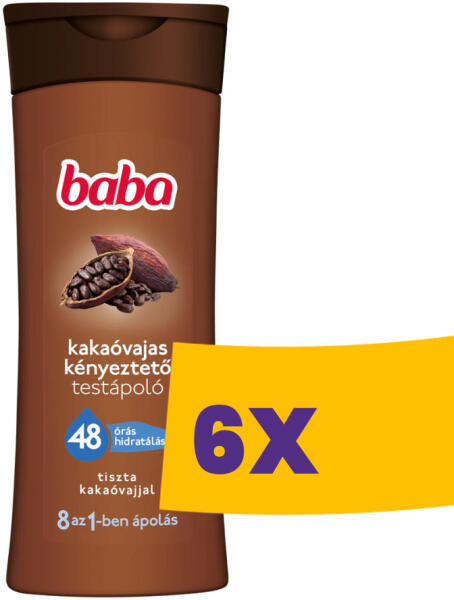 A Baba kakaóvajas kényeztető testápoló kihozza a bőröd természetes ragyogását, bársonyosan puhává és finom illatúvá teszi. A Baba kakaóvajas kényeztető testápoló kihozza a bőröd természetes ragyogását, bársonyosan puhává és finom illatúvá varázsolva azt. Tiszta kakaóvaj hozzáadásával készült, mely ősi kincs, számos bőrbarát hatással. A termék édes, bó
