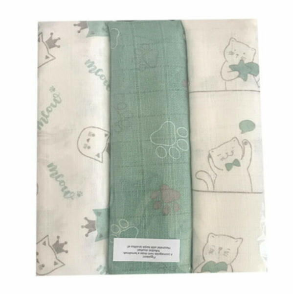 Prémium textilpelenka édes kiscicás mintával. Kapható kék, zöld és rózsaszín árnyalatokban. Kiszerelés: 3 darab/ csomag. Anyaga: 100% pamut