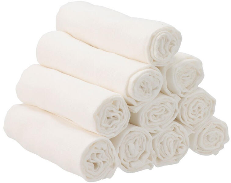 10 db-os vegyes pelenkacsomag. Tartalma: 5db fehér lux textilpelenka 140 g/m2 5db színes textilpelenka (a minták nem választhatók, és nem feltétlen a képen szereplőket tartalmazzák) Anyaguk: 100% tetra pamut A textilpelenkák mérete: 70x80cm