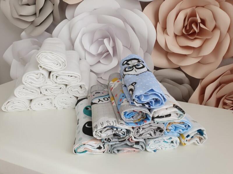 10db fehér lux textilpelenka 140g/m2 10db mintás textilpelenka vegyesen (a minták nem választhatók, és nem feltétlen a képen szereplőket tartalmazzák!) A nyaguk: 100% tetra pamut A textilpelenkák mérete: 70x80cm