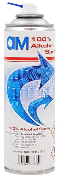 100 % denaturált szesz (etilalkohol) tartalmú spray, mely kiválóan alkalmas tárgyak, eszközök fertőtlenítésére. Sebfertőtlenítésre használni, bőrre juttatni tilos! 100 % denaturált szesz (etil-alkohol), + hajtógáz (Propán, bután, izobután) Kiváló fertőtlenítő hatás. Kiváló tisztító hatás. Kiváló zsírtalanító hatás. Nincs maradvány anyag, foltmentesen szárad