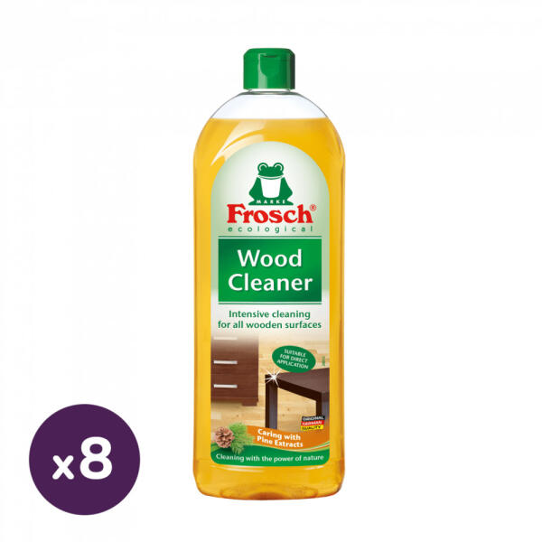 Frosch általános tisztító fa felületre 8x750 ml-es kiszerelésben. Intenzív tisztítást eredményez minden fa felületen. A fenyőből nyert természetes hatóanyagok eltávolítják az erős szennyeződéseket, a vörösbor, kávé, olaj, vagy akár a zsírkréta foltokat. Hígítás nélkül használva csökkenti a fa felületén képződött kisebb karcolásokat. Kellemes, tiszta illatot