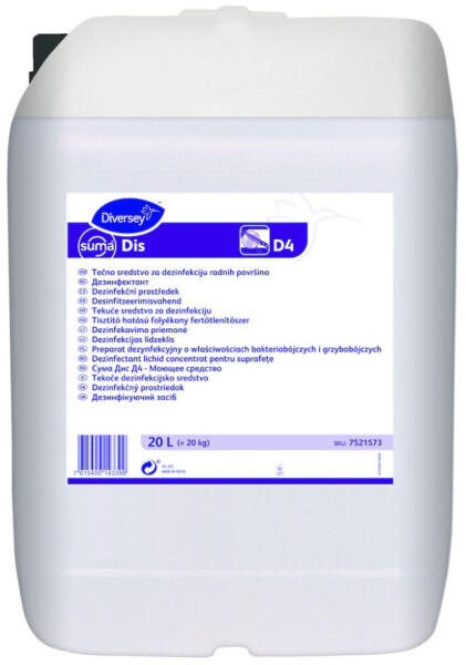 Folyékony, tisztító hatású fertőtlenítőszer A Suma Dis D4 egy koncentrált fertőtlenítőszer minden élelmiszerrel érintkező felülethez. A Suma Dis D4 egy folyékony, koncentrált fertőtlenítőszer minden élelmiszerrel érintkező felülethez. Nagyon hatékony fertőtlenítő hatású a mikro organizmusok széles skálájával szemben, minden vízkeménység mellett. A mikroorganiz
