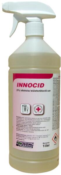 Innocid fertőtlenítő spray, 1 l- Baktericid (MRSA), fungicid, virucid, sporocid, tuberkulocid hatású műszer- eszköz- és felületfertőtlenítő - Az Innocid az egyik leghatékonyabb és legszélesebb hatásspektrumú hatóanyagot tartalmazó fertőtlenítőszer, felületaktív és egyéb segédanyagokkal kombinált koncentrált vizes oldata - A semleges, gyengén lúgos folyadék a benne l