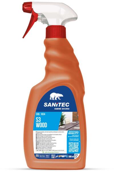 Sanitec S3 Wood - Kiméletes tisztítószer fa felületekhez (500 ml) A Sanitec S3 Wood egy kifejezetten fafelületek tisztítására kifejlesztett kíméletes tisztítószer. Ez a speciális formula nem csak hatékonyan távolítja el a szennyeződéseket, de óvatosan is kezeli a fát, megőrizve annak természetes szépségét. Főbb Jellemzők: Fa felületek kíméletes tisztítása: A S3 Wood