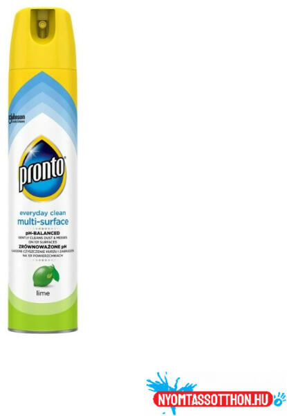 Felülettisztító aerosol 250 ml Pronto® Everyday Clean Multi Surface Lime Pronto spray alaposan t ávolítja el a port, a foltokat és ujjlenyomatokat . Antisztatikus összetevőkkel, ami megakadályozza a por újbóli lerakódását. Gyengéden tisztítja felületeket és eltávolítja a port a fém, a fa, az üveg felületekről. Ezenkívül alkalmazható elektronika eszközökhöz, (kivéve