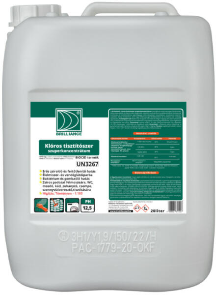 Magas aktív klór tartalmú tisztító és fertőtlenítőszer. Kettős, erős zsíroldó és fertőtlenítő hatás Baktérium- és gombaölő hatású Élelmiszer- és vendéglátóiparba, egészségügyi létesítményekbe Hígítás: 1:25 – 1:100 A Brilliance Klóros tisztítószer koncentrátum használható vizes helyiségek felületeinek, illetve berendezési és felszerelési tárgyaina