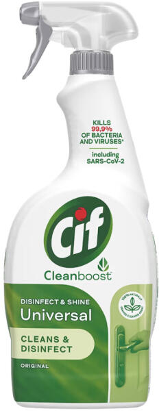 A Cif Cleanboost Disinfect&Shine Univerzális fertőtlenítő spray segít nap, mint nap a kórokozók elleni küzdelemben. Feloldja a konyhai zsírt, eltávolítja a fürdőszobai szennyeződéseket, ragyogó tisztaságot és friss illatot hagyva maga után. Otthonod bármely területén használható. A Cif Cleanboost Disinfect&Shine Univerzális fertőtlenítő spray segít Neked nap, m