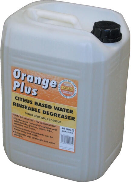 ‘Orange Plus' 'Orange Plus' egy biztonságos de hatékony, citrus alapú oldószeres zsírtalanító. Alkatrészek és berendezések zsírtalanításához. Biztonságosan eltávolítja a nehéz olajokat, zsírokat, bitument, festékeket, ragasztókat és tömítőpasztákat minden fémről, például gépekről, berendezésekről és néhány műanyagról. Nem toxikus és CFC -mentes. Alacsony V