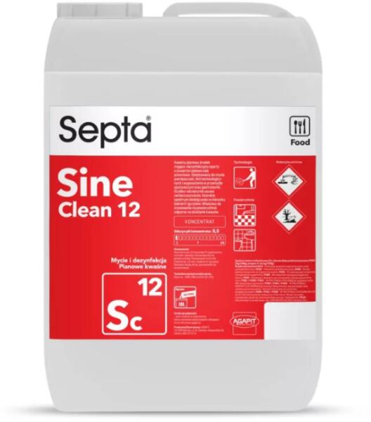 A Septa Sine Clean 12 SC12 az élelmiszeriparban használt tisztító és fertőtlenítő szer. Kvaterner ammóniumsókon alapuló savas hab formuláció. Az élelmiszer- és vendéglátóiparban lévő helyiségek, technológiai vonalak és berendezések tisztítására szánták. Gyorsan és hatékonyan távolítja el a szennyeződéseket. Baktériumok és gombák elleni széles spektrumú bioci