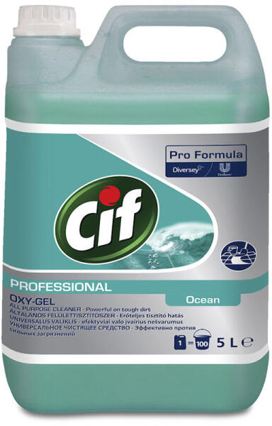 A Cif Professional Oxy-Gel Ocean aktív oxigént tartalmazó általános tisztítószer kitűnően alkalmas padlók és egyéb mosható felületek tisztítására. Alkalmazása során az aktív oxigén mikro-buborékokat hoz létre, melyek segítik a szennyeződések felszedését a felületekről, amit aztán a gél könnyedén és gyorsan eltávolít. Az eredmény kiváló és érezhető tisztas