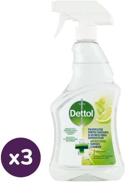 Dettol Antibakteriális Felülettisztító Spray Lime & Menta - Elpusztítja a vizsgált baktériumok és vírusok 99,9%-át* Dettol antibakteriális felülettisztító spray, Lime & Menta (3x500 ml) Termék információk: Fertőtlenítés és tisztítás Benzalkónium-klorid, alkil-poliglikozid (C9-C11), C12-C16 Pareth 7 Tartalmaz Víz, szódabikarbóna, nátrium-karbonát, nátrium-edet