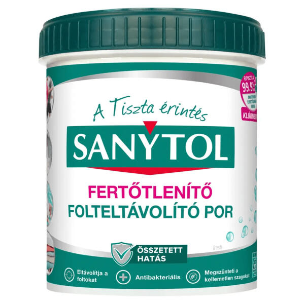 FERTŐTLENÍTŐ MOSÓSZERADALÉK POR 450 G SANYTOL A Sanytol Fertőtlenítő Mosószeradalék egy por formájú termék, amelyet kifejezetten a textíliák fertőtlenítésére fejlesztettek ki mosás közben. A 450 g-os kiszerelésben kapható mosószeradalék hatékonyan elpusztítja a baktériumokat, vírusokat és gombákat, miközben eltávolítja a kellemetlen szagokat is. Elpusztítja a tex