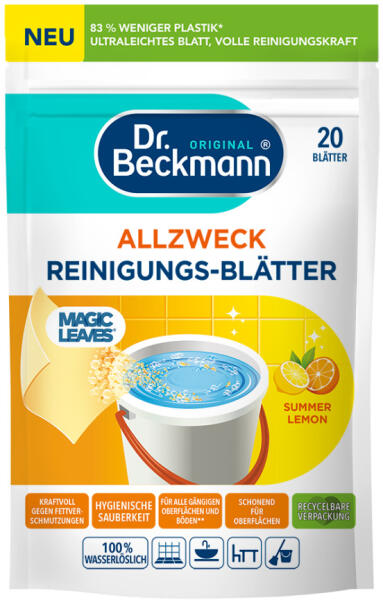 Felület- és padlótisztítás oldható lapokkal! Dr. Beckmann univerzális tisztítólapok forradalmasítják a háztartási takarítást: Az ultrakönnyű lapok 100%-ban oldódnak, és erőteljesen hatnak a szennyeződésekre és zsírokra. Használata nagyon egyszerű: A lapkát tegye a vödörbe, töltse fel vízzel és már kész is a tisztító oldat! A lapkával elkészült oldat minden sz