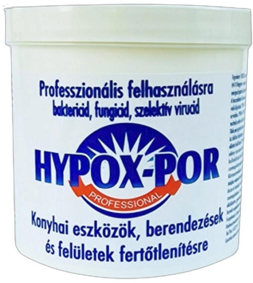 HYPOX KLÓRPOR 500 G ADAGOLÓKANÁLLAL Antimikrobiális spektrum: baktericid, fungicid, szelektív virucid (adenovírus és norovírus inaktváló hatás). Terméktípus: PT2, PT4 Alkalmazási terület: élelmiszeripari, konyhai eszközök, berendezések, felületek fertőtlenítése. Formuláció: szilárd granulátum 1 csomag / 500 g 1 karton / 12 csomag Hypox Klórpor 500 g adagolókanállal te