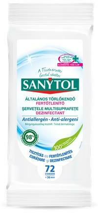 Fertőtlenítő törlőkendő, 36 db maxi/72 db standard, SANYTOL, antiallergén - KHT990 - Általános tisztító és fertőtlenítő szerek - A termék hármas hatású: Baktériumölő (baktericid) az EN 1276 és EN13697 szabvány szerint (behatási idő: 5 perc). Gombaölő (fun