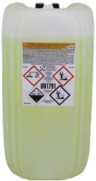 HYPO NÁTRIUM HYPOKLORIT 90 G/LITER 5 LITER A nátrium-hipoklorit (NaCIO) szervetlen vegyület. Vizes oldatát, a hipót fertőtlenítésre, fehérítésre, szagtalanításra használják. GHS piktogram: Figyelmeztetés: Veszély Figyelmeztető mondatok: H290 Fémekre korrozív hatású lehet, H314 Súlyos égési sérülést és szemkárosodást okoz, H335 Légúti irritációt okozhat, H400 Nagy