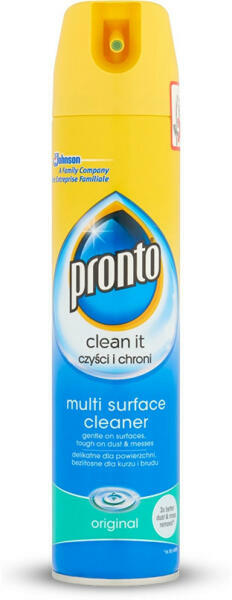 Jázmin illatú Pronto Por-Stop általános felülettisztító aerosol spray gyengéden tisztítja és csíkmentesen portalanítja a fém, fa, üveg és elektronikai készülékek felületét. Nem használható plazma/LCD képernyõkhöz és kezeletlen fához. Használati utasítás:Használat elõtt olvassa el a tájékoztatót. Ne forgassa a kupakot. Használat elõtt rázza fel jól a flakont,