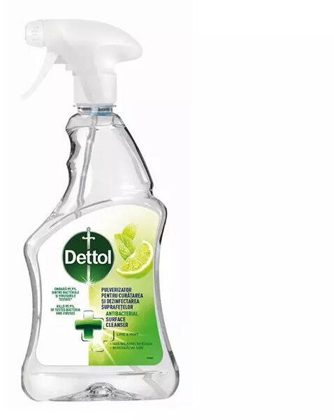 Dettol Antibakteriális Felülettisztító Spray Lime & Menta - Elpusztítja a vizsgált baktériumok és vírusok 99,9%-át* Dettol antibakteriális felülettisztító spray, Lime & Menta (500 ml) Termék információk: Fertőtlenítés és tisztítás Benzalkónium-klorid, alkil-poliglikozid (C9-C11), C12-C16 Pareth 7 Tartalmaz Víz, szódabikarbóna, nátrium-karbonát, nátrium-edetát