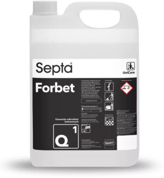 Septa Forbet Q1 professzionális tisztítószer saválló padlók tisztítására. A termék erős és spontán tisztító hatással rendelkezik. Az építkezés utáni szennyeződések eltávolítására tervezték: mész, cement, beton, fugázóanyag maradványok stb. Automata padlótisztító gépekkel és egytárcsás súroló gépekkel való használatra alkalmas, de kézi tisztításnál is