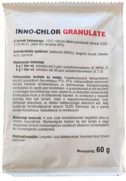 KLÓRGRANULÁTUM 60 G INNO-CHLOR GRANULATE Aktív klór tartalmú fertőtlenítő oldat előállítására alkalmas granulátum GHS piktogram: Figyelmeztetés: Figyelem Figyelmeztető mondatok: H302 Lenyelve ártalmas. H319 Súlyos szemirritációt okoz. H335 Légúti irritációt okozhat. H410 Nagyon mérgező a vízi élővilágra, hosszan tartó károsodást okoz. Foglalkozásszerű felhasznál