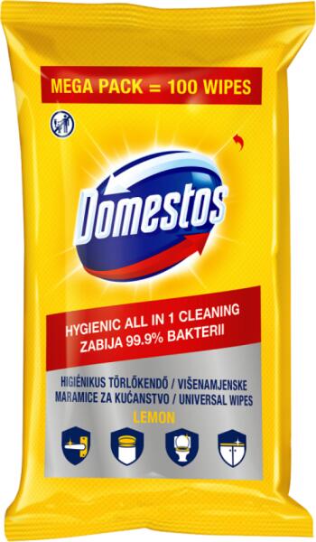 Domestos citromos törlőkendő 100db Hivatalos magyarországi forgalmazótól. Leírás: A citrom illatú Domestos törlőkendő használata egyszerű és praktikus. Higiénikus tisztaságot biztosít a különböző felületeken, mint pl. kilincs, telefon, WC deszka stb. Visszazárható csomagolásának köszönhetően bárhova könnyen magunkkal vihetjük. Tulajdonságok: Nedves törlőkendő c