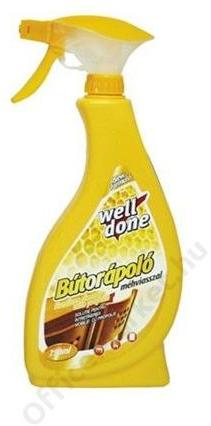 Tisztítja és méhviasz tartalmával ápolja a fa és a laminált felületeket, bútorokat. Használatával a felületek tiszták, ápoltak, fényesek és jó illatúak lesznek. Kiszerelés: 750 ml / flakon (18 flakon / karton) Bútorápoló szórófejes 750 ml méhviasszal Well Done termék alkalmazásakor ügyeljen a biztonságra! Használat előtt mindig olvassa el a címkét és a használati