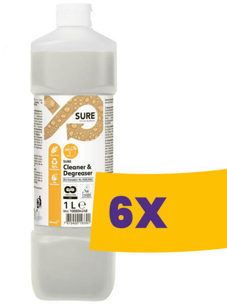 Erőteljes tisztító-zsíroldószer és padozattisztító szer, növényi alapú, 100%-osan lebomló A SURE Cleaner & Degreaser a növényi alapú, 100%-ban biológiailag lebomló professzionális tisztítószerek egyedülálló termékcsaládjának része, minden napi tisztítási igényhez. A SURE Cleaner & Degreaser egy koncentrált nagy teljesítményű zsíroldó a konyhák minden er