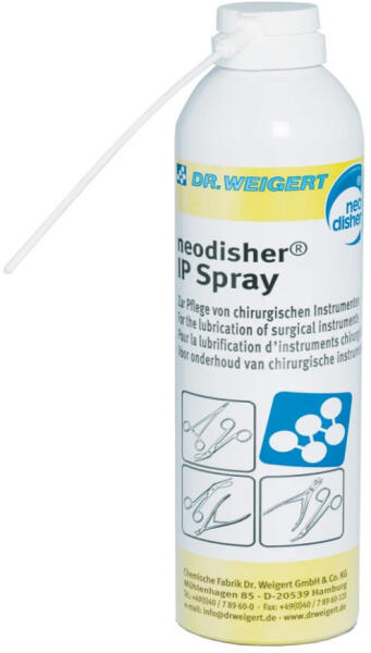 Orvosi tisztaságú fehérolaj alapú műszerápoló spray. A csuklós műszerek gépi előkészítés utáni célzott kézi ápolására. Nem okoz lerakódásokat, és nem befolyásolja a sterilizálást. Dr. Weigert neodisher IP Spray – Az Ön műszerei tökéletes ápolásáért A Dr. Weigert neodisher IP Spray egy speciálisan kifejlesztett, orvosi tisztaságú fehérolaj alapú műszerápol