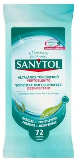 FELÜLETFERTŐTLENÍTŐ KENDŐ 72 LAP/CSOMAG SANYTOL A Sanytol felületfertőtlenítő kendők praktikus és hatékony megoldást kínálnak a mindennapi tisztítás és fertőtlenítés során. Különösen hasznos otthoni, irodai és más környezetekben, ahol gyorsan és alaposan kell fertőtleníteni a felületeket. Csomagolás: 72 kendő egy csomagban, amely könnyen zárható, hogy a kendők