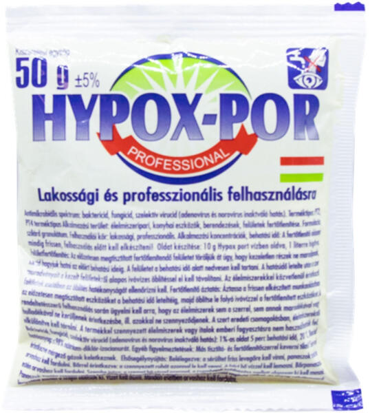 HYPOX KLÓRPOR 50 G Lakossági és professzionális felhasználásra. Antimikrobiális spektrum: baktericid, fungicid, szelektív virucid (adenovírus és norovírus inaktváló hatás). Terméktípus: PT2, PT4 Alkalmazási terület: élelmiszeripari, konyhai eszközök, berendezések, felületek fertőtlenítése. Formuláció: szilárd granulátum GHS piktogram: Figyelmeztetés: Veszély Figyelm