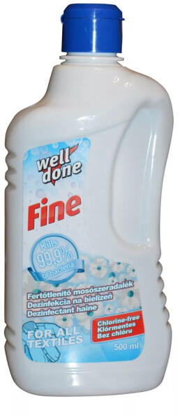 FERTŐTLENÍTŐ MOSÓSZERADALÉK 500 ML WELL DONE Klórmentes, minden színű és típusú textíliához alkalmas. Minden hőmérsékleten hat, elpusztítja a baktériumokat és a mosószer maradványokat. Babaruhák fertőtlenítésére is használható. Típus: koncentrátum. Alkalmazási terület: fertőtlenítő mosószeradalék, biocid termék: 2. terméktípus. Antimikrobiális spektrum: bak