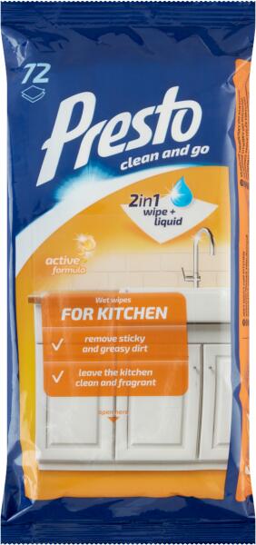 A Presto konyhai nedves törlőkendők eltávolítják a tapadós és zsíros szennyeződéseket, a konyhai felületeket tisztává és illatossá varázsolják.