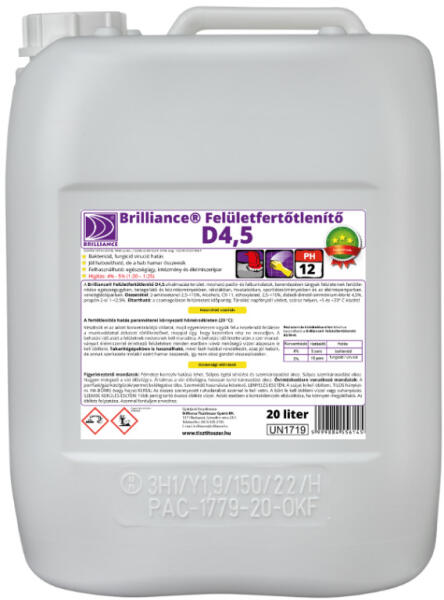 Baktericid, fungicid, virucid hatás. Jól habosítható, de a hab hamar összeesik, ezért felmosóautómatával is alkalmazható. Felhasználható: egészségügy, intézmény és élelmiszeripar. Hígítás: 4% – 5% (1:20 – 1:25) A Brilliance® Felületfertőtlenítő D4,5 alkalmazási terület: mosható padló- és falburkolatok, berendezések tárgyak felületeinek fertőtlenítése egés