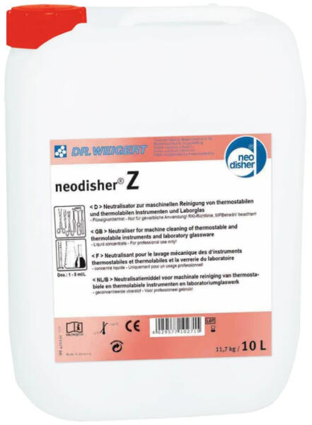 Foszfátmentes, savas gépi semlegesítő. Ideális lúgos mosószermaradékok semlegesítéséhez, különösen érzékeny eszközök (sebészeti műszerek, laborüveg) mosogatásakor. Kíméletes a tisztítandó anyagokhoz. Dr. Weigert neodisher Z egy speciálisan kifejlesztett, folyékony koncentrátum, amelyet elsősorban gépi mosogatás során alkalmaznak. Foszát-, nitrogén- és tenzidment