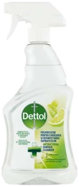 A Dettol antibakteriális felülettisztító spray elpusztítja a vizsgált baktériumok és vírusok 99,9%-át*. Eltávolítja az allergéneket. Kiszerelés: 500 ml / flakon, 6 flakon / karton, 75 karton / raklap (450 flakon/raklap) Fertőtlenítő hatású tisztítószer szórófejes 500 ml Dettol Lime & Mint termék alkalmazásakor ügyeljen a biztonságra! Használat előtt mindig olvassa