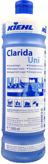 A Kiehl Clarida uni régi neve: Claroline Uni egy professzionális univerzális tisztítószer alkoholtartalommal és felületaktív összetevőkkel. A Kiehl Clarida Uni fel és lemosásra egyaránt alkalmas csíkmentesen, és gyorsan szárad. A ClaroLine Uni (Új neve: Clarida uni)egy általánosan felhasználható tisztítószer a napi takarítás keretein belül. Már igen alacsony alkalmazási