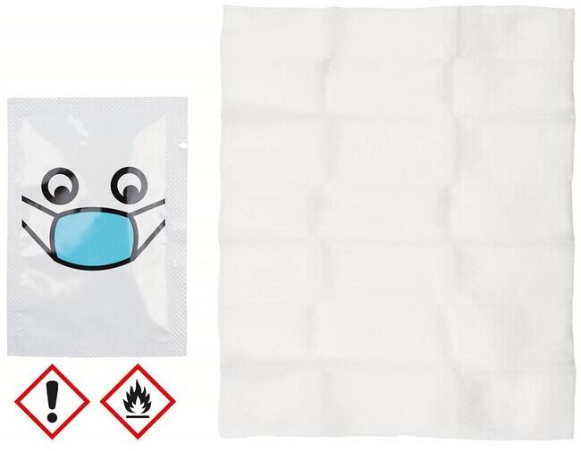 Fertőtlenítő kendő, 18 x 14 cm-es kéz- és bőrfertőtlenítésreÖsszetevők: Etanol (43%), propán-2-ol (22%), víz, glicerin, Aloe Barbadensis levélkivonat, parfüm.