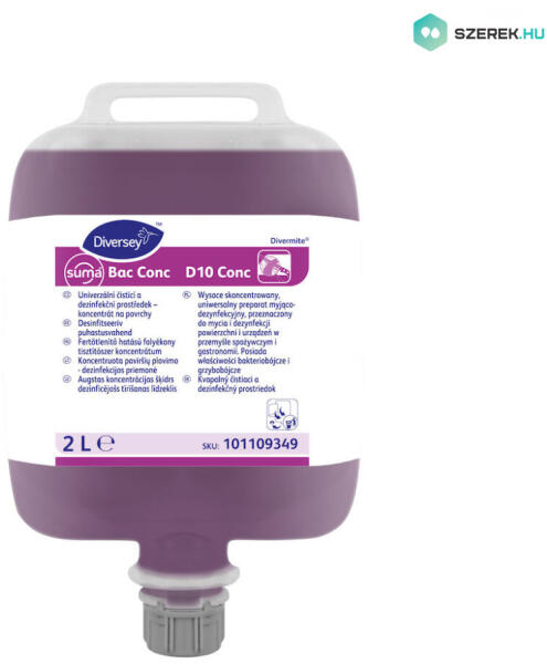 SUMA Bac conc D10 Erősen koncentrált tisztító- és fertőtlenítőszer Termékleírás A Suma Bac conc D10 conc egy erősen koncentrált tisztítószeres fertőtlenítőszer minden felület tisztítására és fertőtlenítésére, beleértve az élelmiszeripari helyiségeket is. Legfontosabb tulajdonságok A Suma Bac conc D10 conc egy kvaterner ammóniumvegyület, egy szekvesztrálószer és