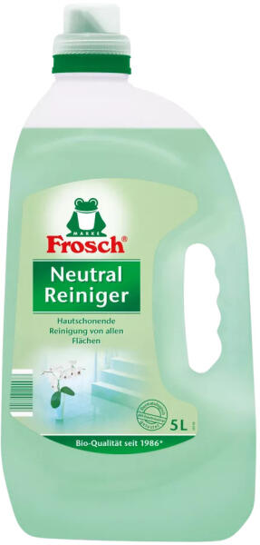 A természetes növényi alapú összetevőkből álló Frosch általános tisztítószer rendkívül hatékony padlótisztításhoz, konyhai-, és fürdőszobai takarításhoz (csempe és szanitertisztításhoz is), ugyanakkor gyengéd a bőrhöz, még gyakori használat esetén is. Általános tisztítószer Növényi alapú összetevőkből Hatékony padlótisztításhoz, konyhai-, és fürdős